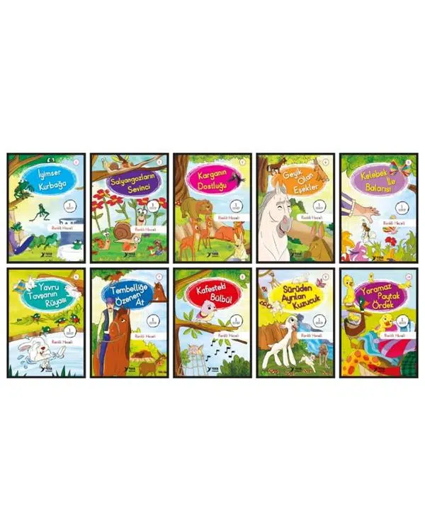 Set içinde; İyimser kurbağa, Salyangozların sevinci, Karganın dostluğu, Geyik olan eşekler, Kelebek ile balarısı, Yavru tavşanın rüyası, Tembelliğe özenen at, Kafesteki bülbül, Sürüden ayrılan kuzu ve Yaramaz paytak ördek kitapları yer almaktadır.