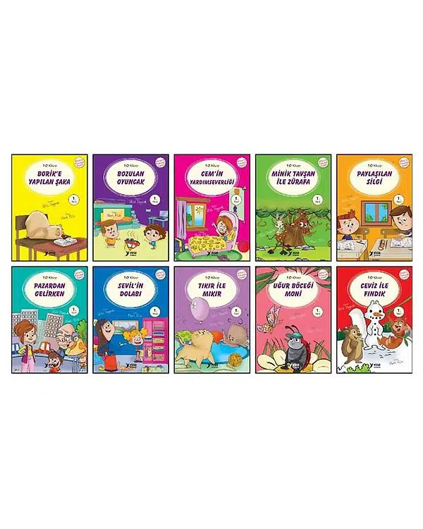 Set içinde; Borike yapılan şaka, Bozulan oyuncak, Cemin yardımseverliği, Minik tavşan ile zürafa, Paylaşılan silgi, Pazardan gelirken, Sevilin dolabı, Tıkır ile mıkır, Uğur böceği moni ve Ceviz ile fındık kitapları yer almaktadır.