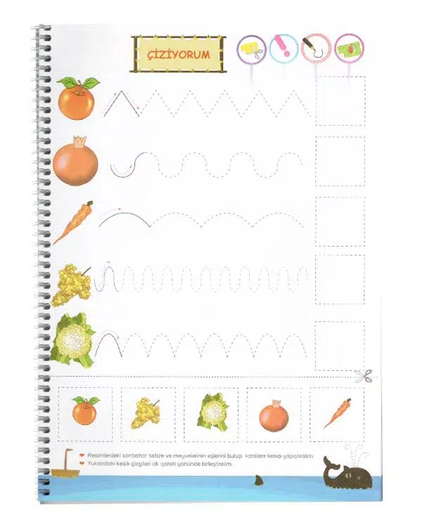 Bu kitap içerisinde çocuklarınız günlük yaşamda karşılaştığı kavramları; kesme çalışmaları, çizgi çalışmaları, kesme çalışmaları ve görsel algıyı destekleyen çalışmalar ile pekiştirebilecek.