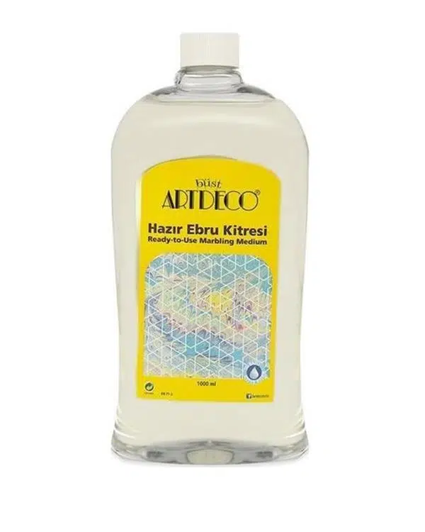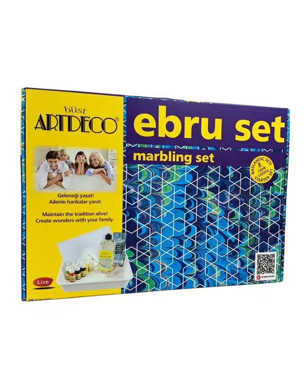 Artdeco başlangıç seti ile Ebru sanatının tadını çıkarmaya hazırlanın. Artdeco Ebru seti içinde yer alan malzemeler dışında ekstra bir malzemeye ihtiyaç duymazsınız. Bu başlangıç seti ile su üzerinde yaratıcı desenler oluşturabilir; bu desenleri kâğıt üzerine aktararak sanatınızı tabloya dönüştürebilirsiniz. Ebru sanatına olan ilginizi profesyonel hale dönüştürecek olan bu ebru seti ile yeteneğinizi ortaya çıkaracaksınız. Ebru kitresi hazırlanışı: 1 litre ılık su içerisine yaklaşık olarak 5 g (yaklaşık 2 çay kaşığı) kitre eklenir. Ilık suya yavaşça ilave edilen kitre, boza kıvamında veya biraz daha seyrek olmalıdır. Hazırlanan sıvı ince bir tülbent ile süzülerek temizlenir Son haliyle tekneye köpürtmeden yavaşça boşaltılır.