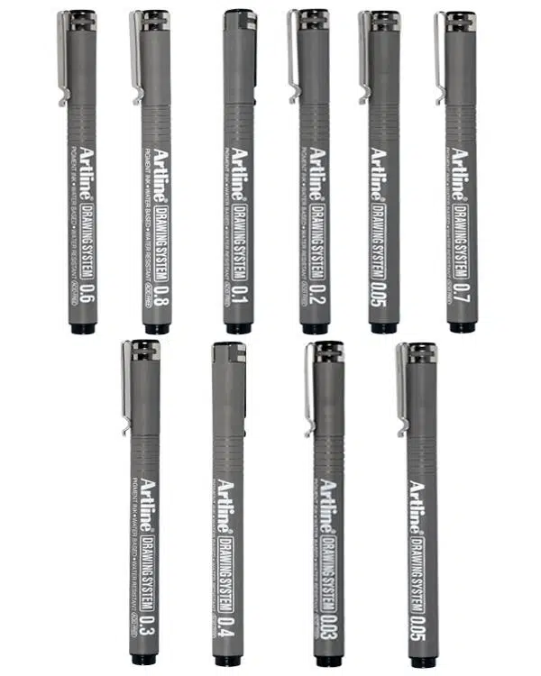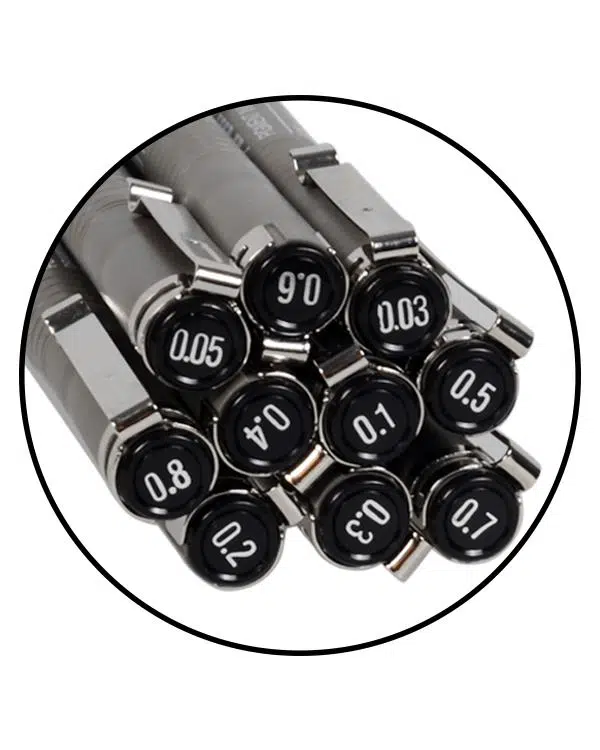 0.05 mm, 0.03 mm, 0.1 mm, 0.2 mm, 0.3 mm, 0.4 mm, 0.5 mm, 0.6 mm, 0.7 mm ve 0.8 mm fiber uçlu kalem yer almaktadır.