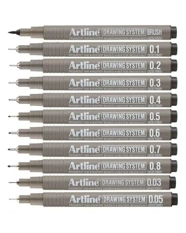 Brush, 0.1 mm, 0.2 mm, 0.3 mm, 0.4 mm, 0.5 mm, 0.6 mm, 0.7 mm ve 0.8 mm, 0.03 mm ve 0.05 mm, fiber uçlu kalem yer almaktadır.