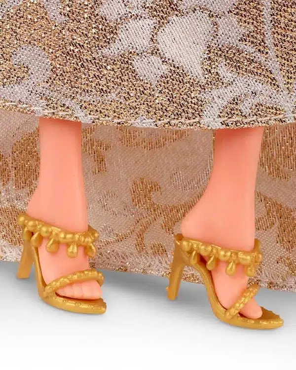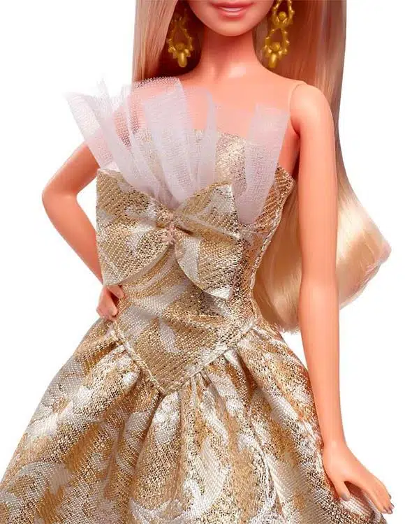 Yılbaşına hazır bir yıldız! Barbie 2025 Mutlu Yıllar Bebeği, ışıltılı straplez elbisesiyle göz kamaştırıyor. Elbisesindeki gümüş ve altın damask desenleri, fırfırlı tül yakası ve hacimli eteğiyle zarafet saçıyor. Altın rengi küpeleri ve topuklu ayakkabıları ise görünümünü tamamlıyor.