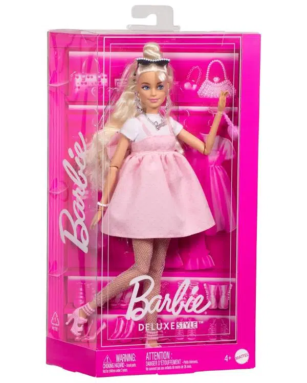 Barbie Deluxe Style Sarı Saçlı Bebek kutusu içerisinde; 1 adet Barbie bebek, arkasında büyük bir fiyonk bulunan pastel renkli şirin mini elbise ve altındaki beyaz tişört, pembe file çoraplar, Barbie’nin zarif takıları, inci taşlı bir güneş gözlüğü, kalp şeklinde bir çanta ve bant detaylı, fiyonklu ayakkabılar mevcuttur.