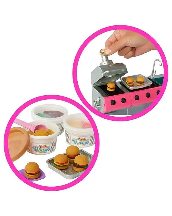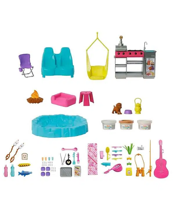 7 oyun alanı ve yavru köpek de dahil olmak üzere 60'tan fazla aksesuar içermektedir. Barbie bebekler ayrı satılır.