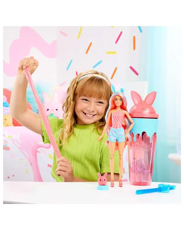 Kutu içerisinde; Barbie bebek, slime’lı bardak, pipet ve kapak, evcil hayvan, pipet aksesuarı, ayakkabı, taç, giyim aksesuarı ve evcil hayvan yatağı bulunmaktadır.