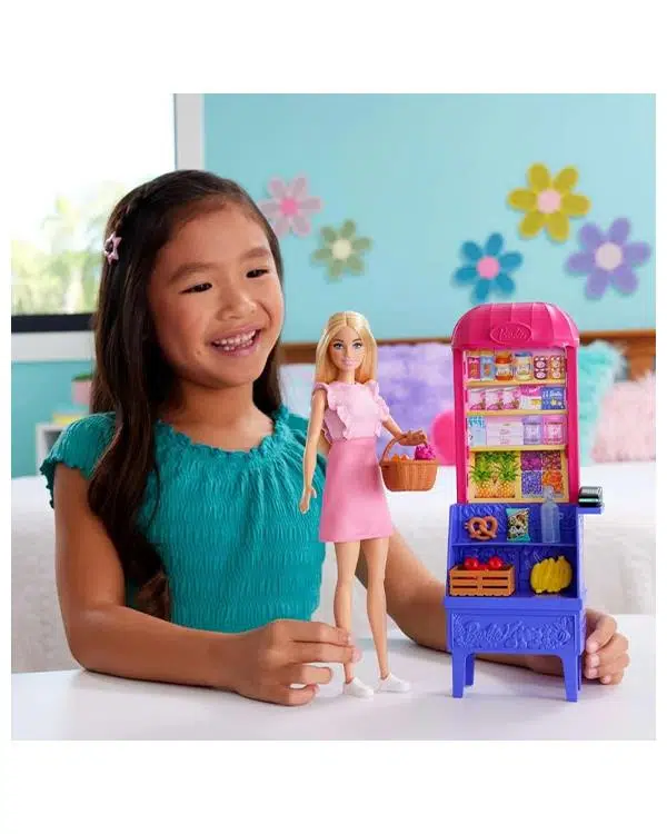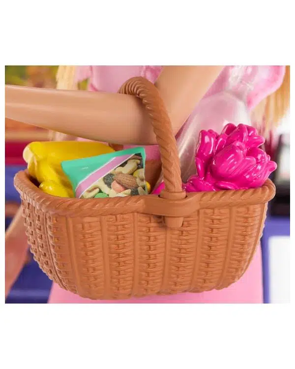 Kutu içerisinde; Malibu bebek, market standı, sepet, kasa, çiçek buketi, su şişesi, pos cihazı, kart, muz salkımı, havuç, elma, cips ve pretzel bulunmaktadır.