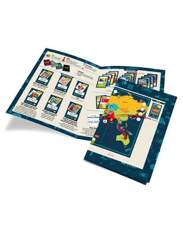 Kutu içerisinde; 1 oyun tablası, piyon, 16 adet pul, kum saati, 216 adet oyun kartı, 18 adet sürpriz kart, 18 adet bil bakalım kartı, 40 adet uçak bileti, 4 adet pasaport, 2 adet kart kutusu, uçak bileti kutusu, oyun kılavuzı ve cevap anahtarı yer almaktadır.