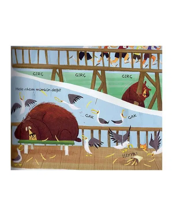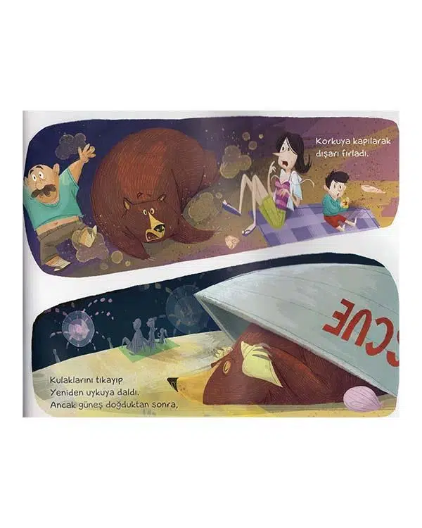 Pat pat seslerinden orda da uyuyamadı. Düdük seslerine uyandı. Küçük kediyi kurtardı. En sonunda aynı otobüsle geri döndü ve ormanında uykuya daldı. Ayıların gürültülü bir ortamda uyuyamadığını, her canlını n kendi evine ait olduğu anlatılmaktadır. Hikayeye uygun resimlendirmelerle olay çocukların hayal dünyasında daha kolay canlanacaktır.
