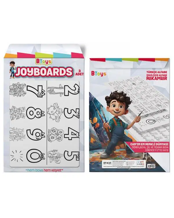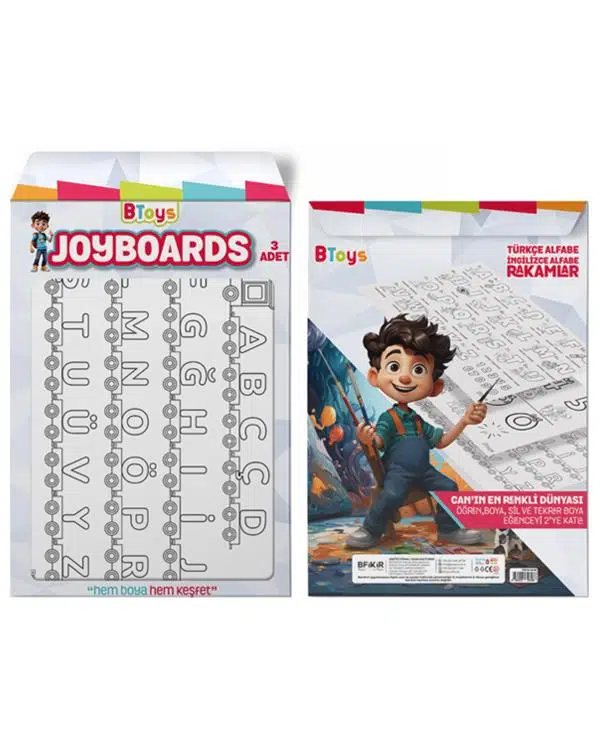 Btoys Joyboards 3`lü Set ile çocuklarınızın eğlenceli ve öğretici bir şekilde vakit geçirmesini sağlayabilirsiniz. Bu setin içerisinde, Türkçe alfabe, İngilizce alfabe ve rakamlar temalı boyama panolarından oluşan her bir pano, çocukların hem öğrenmelerine hem de yaratıcılıklarını geliştirmelerine yardımcı olacak şekilde tasarlanmıştır. Çocuklar, özel yüzeyi sayesinde boyanan alanları silip tekrar boyama yapabilirler.