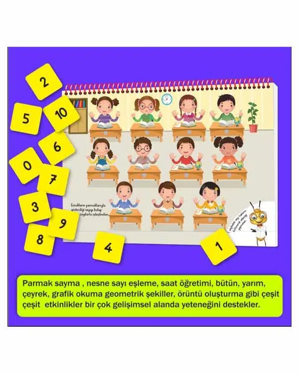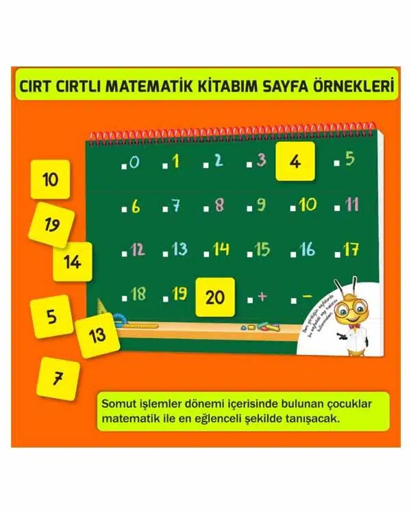 Somut işlemler dönemi içerisinde bulunan çocuklar matematik ile en eğlenceli şekilde tanışacaklar. Kalın kartondan yapılmış sayfalar uzun kullanıma uygundur. Çeşit çeşit etkinliklerle matematiğin en temel kavramlarını öğrenebileceksiniz. Kitabın içerisindeki tüm sayı ve nesne sayma tuşları kullanarak çıkarma ve toplama işlemlerini eğlenerek öğrenebileceksiniz. Etkinlikleri cırt cırt özelliğinden dolayı tekrar tekrar öğrenebileceksiniz. Çocuklarınızın el-göz koordinasyonun, ince motor becerilerinin, sayısal zekâ becerilerinin ve görsel algı becerilerinin gelişimini destekler.