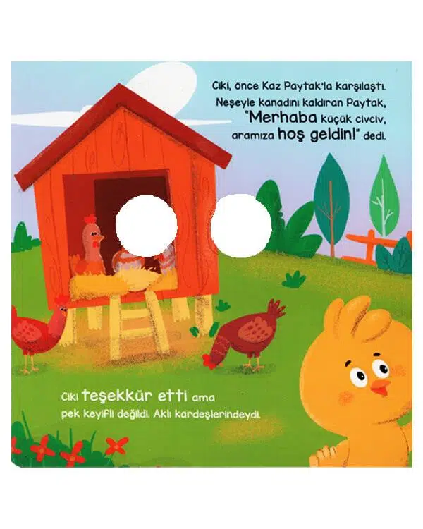 2 yaş ve üzeri çocuklar için uygundur. Çiftliğe yeni katılan sevimli Civciv Ciki ve çiftlikte yaşayan sabırlı dostlarını eğlenceli büyük gözleri ile görmeye hazır olun! Civciv Ciki, Anne Tavuk Gıdak, Kaz Paytak, Horoz Hürhür, Keçi Gudu ve Kaplumbağa Kapki… Çocuğunuz bu kitaptaki kahramanlarla tanışırken sabırlı olmayı eğlenerek öğrenecek. Çocuk gelişimi uzmanı gözetiminde hazırlanmıştır.
