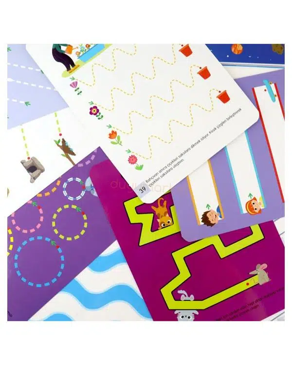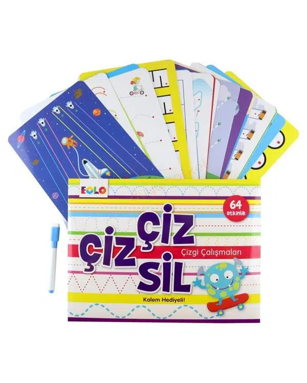 Çocuklarımız okul öncesi dönemlerinde bizim işlediğimiz, şekillendirdiğimiz hamurlardır. Bu nedenle erken çocukluk döneminde yaptığımız çalışmalar onların sosyal, duygusal ve bilişsel becerilerinin temellerini oluşturur. Bu dönemde önemli olan hazırlık çalışmalarından biri de çizgi çalışmalarıdır. Kolaydan zora doğru sıralanmış bu çalışma sayfaları silinip yazılabilir şekilde tasarlanmıştır ve zarfın içinde özel bir kalemde bulunmaktadır. Bu çalışma sayfaları sayesinde çocuklar eğlenceli vakit geçirirken, yazı yazma becerilerini geliştirmek için tekrar tekrar pratik yapma imkânı da bulacaklar.