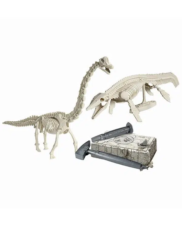 Set İçeriği: Dinozor fosillerinin gizlendiği kazı bloğu, 2 adet fosil bloğu, Mosasaurus iskeleti, Brachiosaurus iskeleti, 1 paket alçı (Paris Alçısı), Şekil vermek için kalıp, Kazı çekiçi, Kazı keski aleti, 2 adet resimli kullanım kılavuzu.