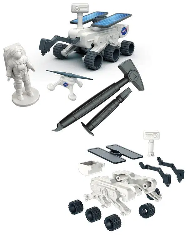 Set içerisinde; asteroit bloğu, uzay keşif aracı parçaları, insansz hava aracı parçaları, astronot, çıkartmalar, taş örneği, çekiç, keski ve kullanım kılavuzu bulunur.