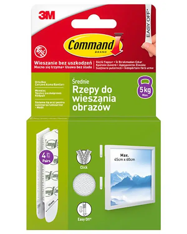 Command Orta Boy Cırt Cırt Bant, tablo ve çerçevelerinizi duvara zarar vermeden asmanızı sağlayan pratik ve güçlü bir sabitleme çözümüdür. Özel yapışkan teknolojisi sayesinde yüzeye sıkıca tutunur ve ihtiyaç duyulduğunda iz bırakmadan kolayca çıkarılabilir.
