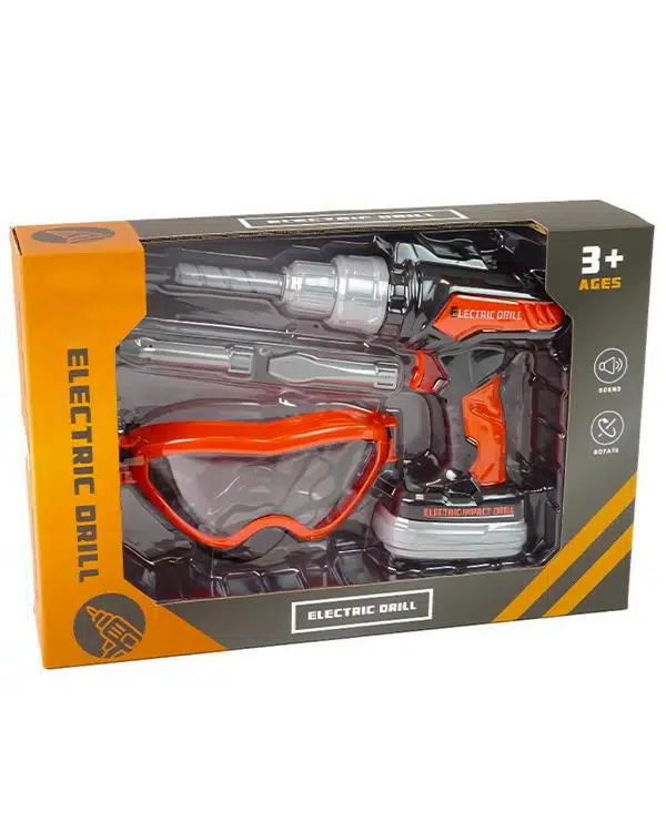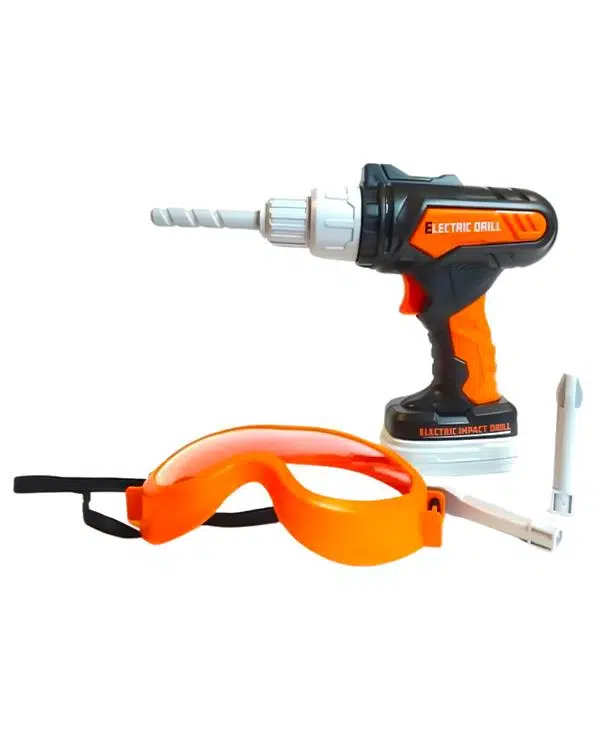 Set içeriğinde, gerçek boyutlara uygun elektrikli matkap, güvenlik gözlükleri ve çeşitli aksesuarlar bulunuyor.