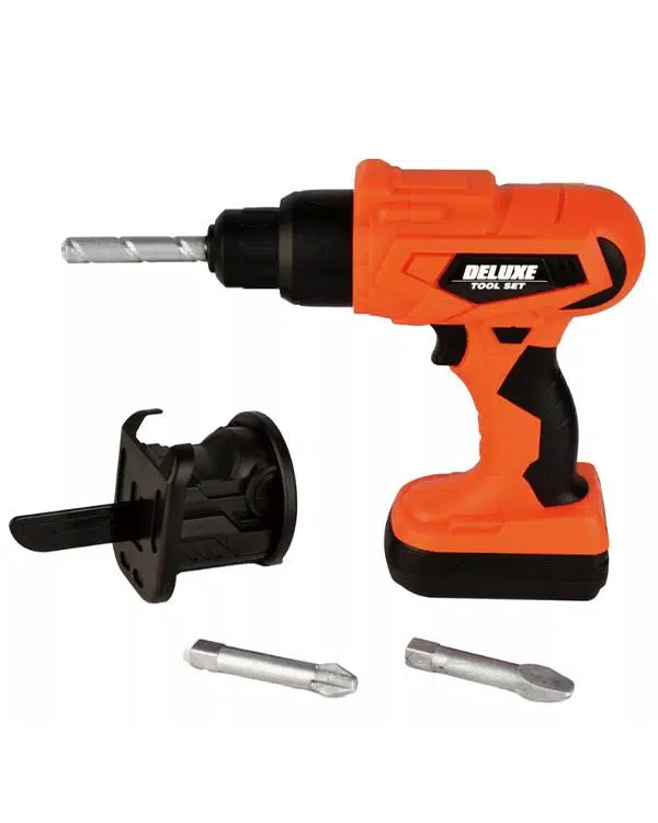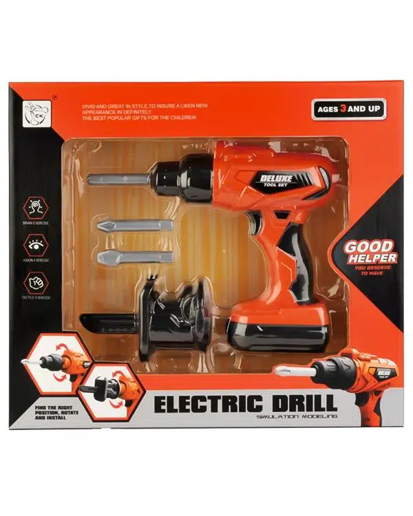 Set içeriğinde, gerçek boyutlara uygun elektrikli matkap ve çeşitli aksesuarlar bulunuyor.
