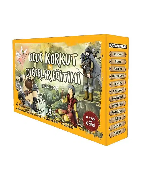 Dede Korkut İle Değerler Eğitimi Seti, Türk edebiyatının klasik hikâyelerinden esinlenerek yazılmış beş heyecan verici kitabı içermektedir. Bamsı Beyrek, Banu Çiçek ve Boğaç Han gibi karakterlerin maceralarını keşfederken, cesaret, arkadaşlık, yardımlaşma gibi önemli değerler eğitilir. Bu kitaplar, Türk kültürünü ve yüksek insani değerleri günümüz gençlerine eğlenceli bir dille sunarak ahlaki eğitimde somut katkı sağlamaktadır.