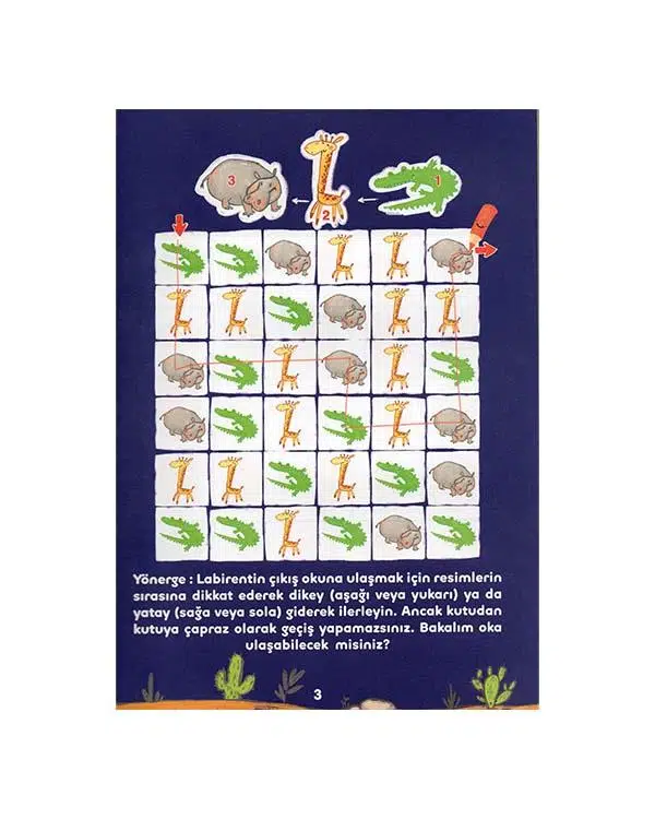 Bu kitaptaki alıştırmalar, sonuca ulaşmak için kutudan kutuya geçmeyi gerektiren bir kod dizisi gibidir. Çocuklar alıştırmaları yaparken fotoğrafların sırasına dikkat ederek dikey (aşağı ya da yukarı), yatay (sağa ya da sola) gitmelidir. Çapraz geçişler yapılmamalıdır. Hedef labirentin çıkış okuna ulaşmaktır.
