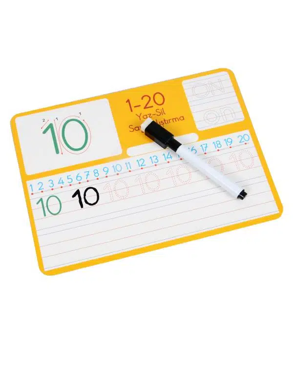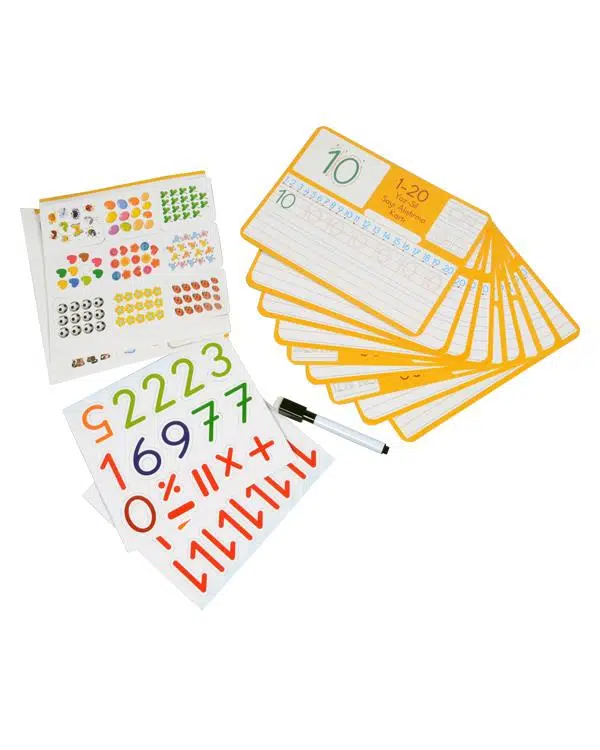 10 arkalı önlü yaz-sil sayı alıştırma kartı, 30 sayı taşı, 5 işlem taşı, 20 resimli kart, 1 silinebilir kalem, etkinlik kılavuzu
