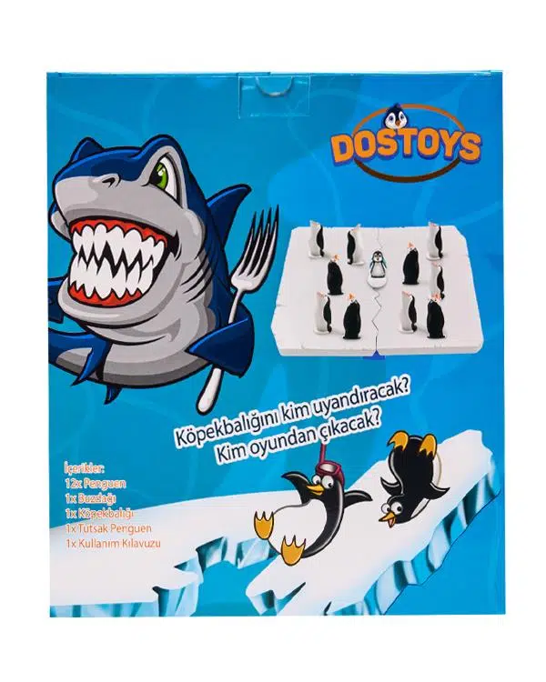 Kutu içeriği: 12 adet penguen, 1 adet buzdağı, 1 adet köpekbalığı, 1 adet tutsak penguen, 1 adet kullanım kılavuzu.