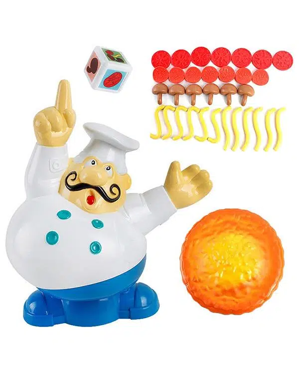 İçindekiler: 1 pizza tahtası, 1 oyun zarı ve zar etiketleri, 32 adet yemek oynama parçası, 1 şef karakter.