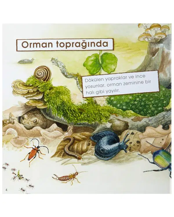 İlkbahar, yaz, sonbahar, kış fark etmez. Ormanda her mevsim hayvanların besine ve korunmaya ihtiyaçları vardır. Ağaçlardan hayvanlara kadar ormanlarda keşfedebileceğin şeylerin sınırı yok. Yeşil ağaçkakanlar ne yer? Geceleri hangi hayvanlar uyumaz? Yerin altına yuva yapan hayvanlar hangileri? Kozalak hangi ağaçta yetişir? Hadi gidip ormanları birlikte keşfedelim. Çocuklar ormanla ilgili kavramları ve sözcükleri keşfederken çok eğlenecekler.