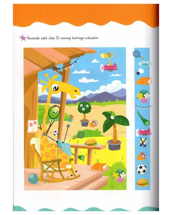 Pek çok noktaya dikkat ederek düzenlenen bu çalışmada görsel odaklanma, görsel ayırt etme, nesneler ve mekânlar arasında bağ kurma alıştırmalarının yanı sıra çocuğun muhakeme becerisini geliştirmesini sağlayacak benzerlik-farklılık, eşleştirme-gruplama, sıralama, şekil tanıma, boyama gibi birçok alıştırma bulunmakta.
