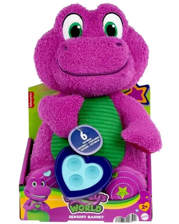 Fisher Price Barneys World Sensory Barney Peluş Oyuncak HYG89, dokunsal duyuları harekete geçiren çeşitli yüzey dokuları ve etkileşimli detaylarıyla bebek-okul öncesi dönemdeki çocuklara sakinlik ve güven hissi sunar. Yaklaşık 32,5 cm (12,75 inç) boyundaki oyuncak, yumuşak kabartmalı karın bölgesi, ipek gibi elleri ve ayağında işlemeli çizgi ve spiraller gibi izlenebilecek desenleriyle minik ellerin keşfetmesini sağlar. Barney’nin eline bağlı kalp şeklindeki pop-it aparatı, dokunma ve bastırma yoluyla eğlenceli duyusal tepkiler verir.