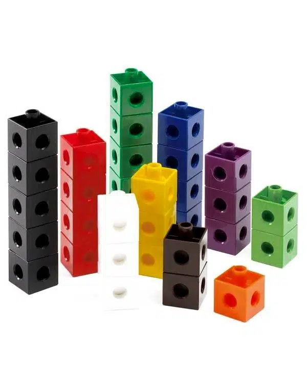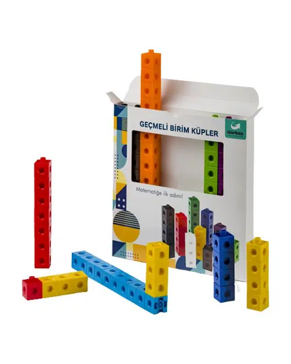 Geçmeli birim küpler, matematik uygulamalarında örüntü, dört işlem, birlik onluk yüzlük kavramı, geometrik şekiller öğretimi gibi pek çok farklı oyun ve etkinlikte kullanılabilmektedir. Birim küpler, aynı boyutlara sahip küplerdir. Her bir küp her bir birimi ifade eder. Birim küpler ölçme, modelleme, denge ve odaklanma, sıralama ve gruplandırma, el ve göz koordinasyonu gelişimine katkı sağlar. Çocukların hayal dünyasının gelişimini destekler. Birim küpler, 100 parça ve 10 renkten oluşmaktadır. Her kenarı 2 cm boyutundadır.