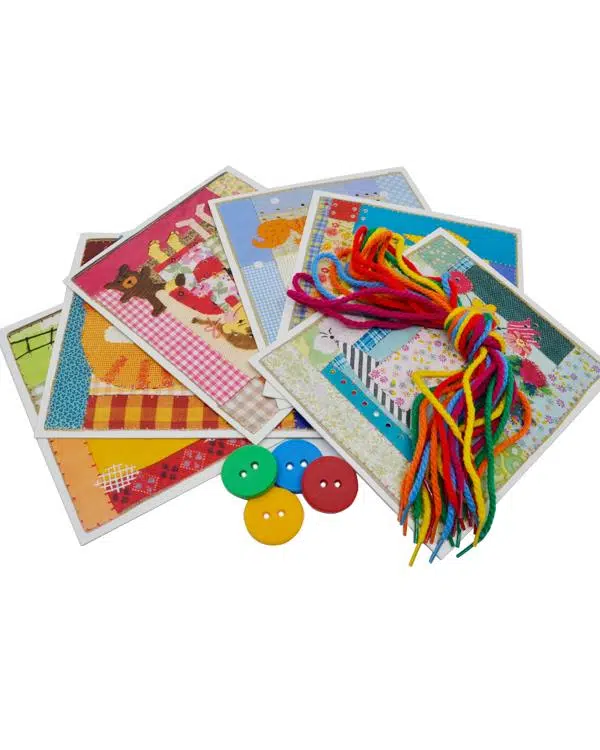 Kutunun içinden rengarenk 6 resim çıkacak. Bu güzel resimler sayende daha da güzel olacak! Resimlerdeki deliklerden ipleri geçirerek tatlı kediye bıyık, çuf çuf ve lokomotife düğmeden tekerlek ekleyebilirsiniz...