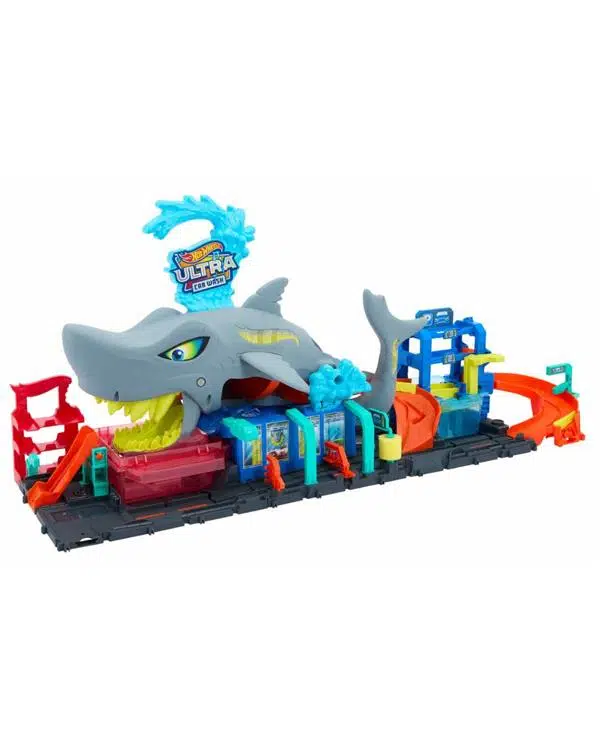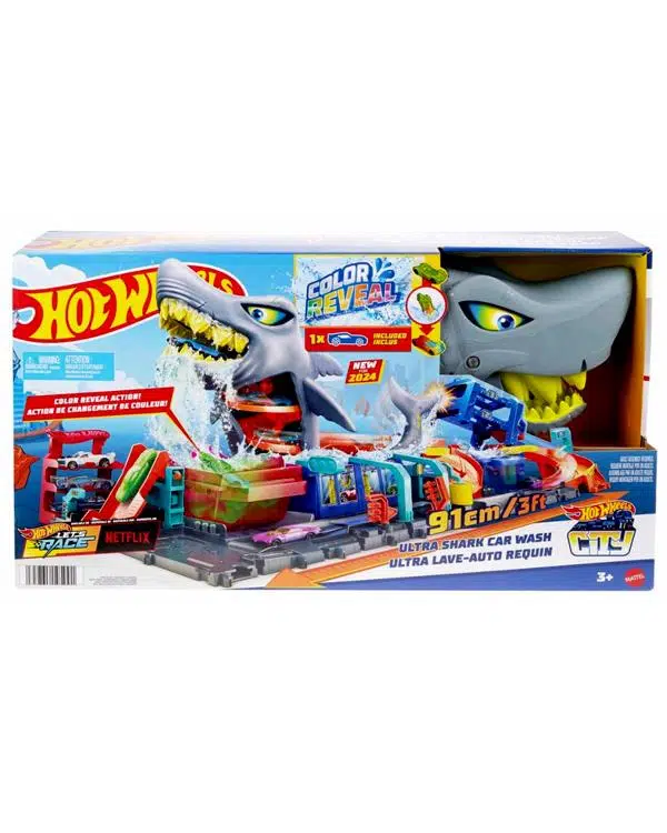 Devasa keskin dişli köpekbalığına dikkat! Çocukların çok sevdiği 'Let's Race' adlı Netflix serisindeki gerçekçi görünümüyle Hot Wheels Şehri Muhteşem Köpek Balığı karşınızda. Devasa köpek balığının dişleri arasında Araba Yıkamaya, renk değiştirmeye hazır mısınız? Çocuklar, sete dahil olan renk değiştirme özellikli aracı, rampadan geçirip köpek balığının ağzına doğru götürür, ardından köpek balığının başına basarak suyun rengini değiştirip arabanın süslemelerini ortaya çıkarabilirsiniz. İkinci kademede arabayı köpek balığına yerleştirebilir, ardından arabanın köpek balığının içinden geçerek aşağı inmesini seyredebilirsiniz.