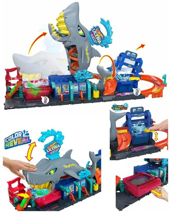 Arabaların otoparktan yarışa başlaması veya soğuk su tankına girip sürpriz bir şekilde renk değiştirmesini izlemek için köpek balığının kuyruğuna dokununuz. Arabayı tekrar suya batırarak renginin eski haline dönmesini sağlayınız. Hareketli kapılar ve gerçek hayattaki araba yıkama yerlerinde bulunan makinelere uygun olarak tasarlanan ayrıntılı pist özellikleri ile Hot Wheels Şehri Muhteşem Köpek Balığı Araba Yıkama Oyun Seti oyunlarınıza biraz daha macera katacaktır. Bu gerçekçi oyun seti, çocukların yeni hikayeler oluşturarak hayal güçlerini ve yaratıcılıklarını gelişmesini desteklerken eğlenceli vakit geçirmelerine yardımcı olur.