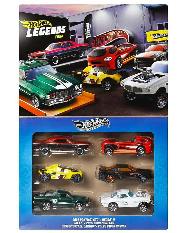 Hot Wheels Silver Series Efsane Temalı 6’lı Metal Araba Seti JBY78, özel kutulu bir set olup Hot Wheels tarihinden seçilmiş 6 klasik otomobili içeriyor: 1967 Pontiac GTO, Deora II, 2Jetz, 2005 Ford Mustang, Custom 1971 El Camino ve Volvo P1800 Gasser. Her araç 1:64 ölçeğinde olup metal gövde, detaylı boya ve özel dekoratif öğelerle donatılmıştır. Parlak detaylar ve yüksek yüzey kalitesi ile dikkat çeker; hem oyuncağa meraklı çocuklar hem de araba modelleyen tutkunları için ideal seçimdir.