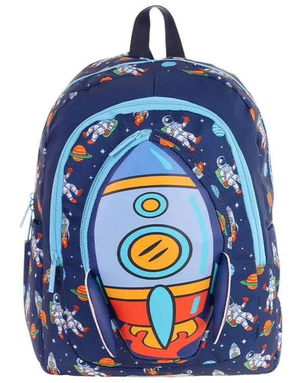 Lacivert renkte ve 3D roket tasarımlı olan çanta, çocukların ilgisini çeken şık bir görünüme sahiptir. Fermuarlı üç bölmesi bulunur: geniş ana bölme, orta bölme ve kalemlik olarak kullanılabilen ön cep. A4 formatında kitap ve resim defteri için geniş alan, özel iç bölme ve çantanın her iki yanında su şişesi veya matara için cepler bulunmaktadır.