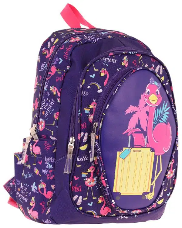 Pembe-Mor renkte ve 3D flamingo tasarımlı olan çanta, çocukların ilgisini çeken şık bir görünüme sahiptir. Fermuarlı üç bölmesi bulunur: geniş ana bölme, orta bölme ve kalemlik olarak kullanılabilen ön cep. A4 formatında kitap ve resim defteri için geniş alan, özel iç bölme ve çantanın her iki yanında su şişesi veya matara için cepler bulunmaktadır.