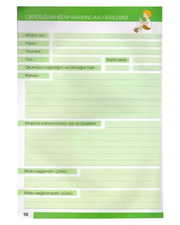 Okuduğunuz kitaplardan çıkardığınız sonuçları yazacağınız, kitapta geçen sevdiğiniz bir sahneyi çizeceğiniz ve kitap özelliklerini not edebileceğiniz harika bir okuma defteri.