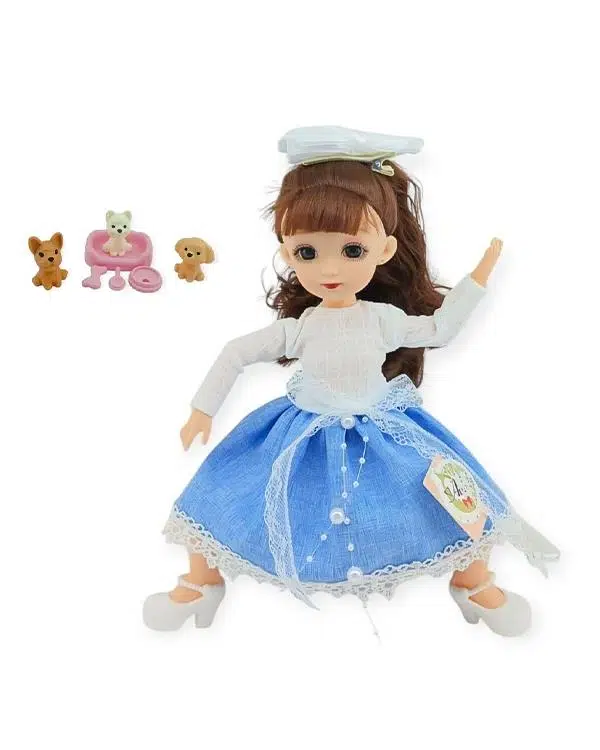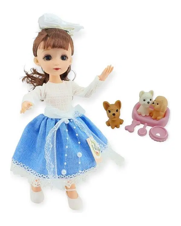 Bu versiyon, sette yer alan küçük evcil hayvan figürleriyle birlikte gelir. Birkaç sevimli köpek figürü, mama kabı, kemik ve mini yatak gibi aksesuarlar sayesinde çocuklar hem bakım hem de evcilik temalı oyunlar kurabilir. Bu detaylar, bebeğin oyun sahnelerini zenginleştirirken aynı zamanda empati, sorumluluk ve hayal gücü gelişimini destekler. Mavi etekli şık tasarımı, hem günlük oyun senaryoları hem de doğa temalı hikâyeler için etkileyici bir atmosfer oluşturur.