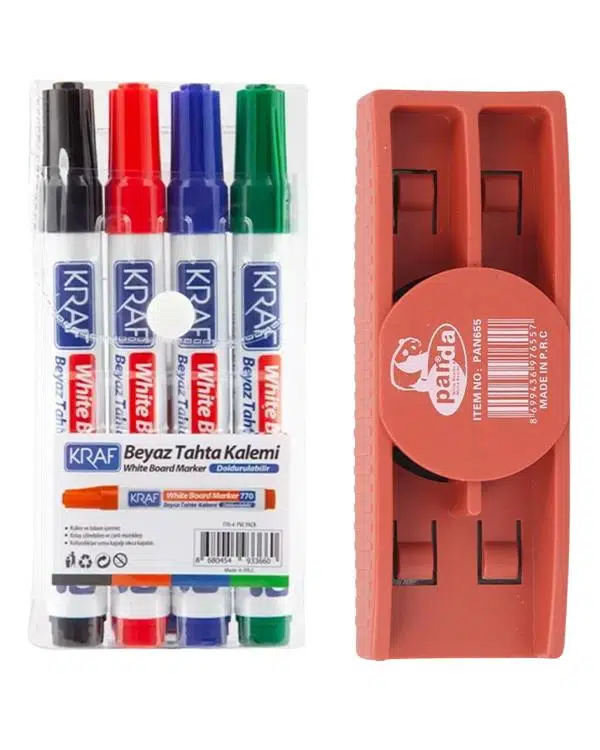 | Etiketler | Kraf Doldurulabilir Beyaz Tahta Kalemi 4lü ve Panda Mıknatıslı Yazı Tahtası Silgisi Set |