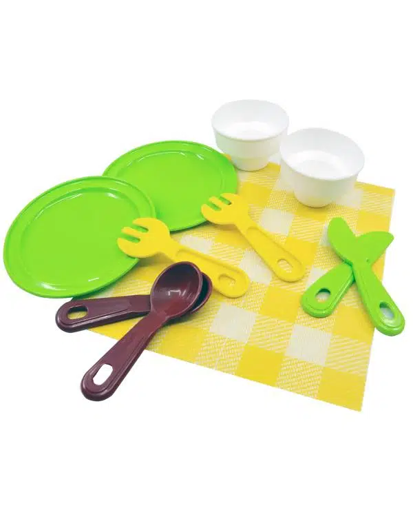 2 Adet Tabak – 2 Adet Çatal – 2 Adet Bıçak – 2 Adet Kaşık – 2 Adet Bardak – 1 Adet Merdane – 1 Adet Piknik Örtüsü – 8 Adet Oyun Hamuru (20gr. x 8)