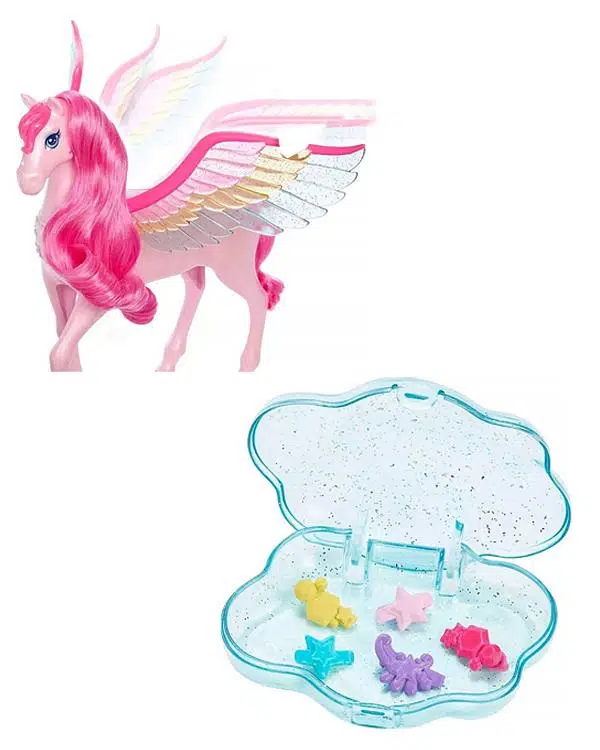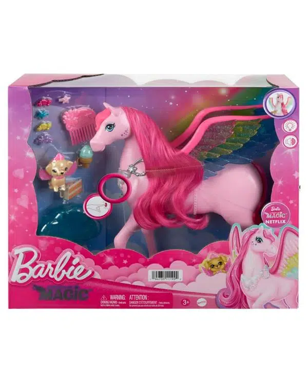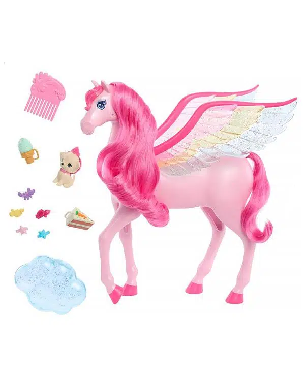 Uzun pembe yelesi, gökkuşağı kanatları ve 10 farklı aksesuarıyla karşınızda Barbie Pegasus! Barbie a Touch of Magic’den ilham alan bu büyülü Pegasus ile filmden en sevdiğiniz sahneleri canlandırabilir ya da kendi hikayelerinizi oluşturabilirsiniz. Pegasus’un uzun kanatları ile yeni maceralara yelken açmasını sağlayabilir birlikte keşfedilmemiş diyarlara yolculuk edebilirsiniz. Üstelik bu yolculukta sana ve Pegasus’una küçük sevimli bir köpek yavrusu da eşlik edebilir. Pegasus uzun pembe yelesi, kuyruğu ve ışıltılı kanatlarının yanı sıra ışık ve ses özellikleriyle birlikte geliyor! Gökkuşağı ışıklarını görmek ve Barbie a Touch of Magic tema şarkısı dahil farklı büyülü sesler duymak istiyorsanız Pegasus’un kolyesine basabilirsiniz veya bunları kanatlarını hareket ettirerek de yapabilirsiniz. Havuç ve dondurma yedirerek Pegasus atınızın karnını doyurabilir ve çıkardığı sesleri de duyabilirsiniz.