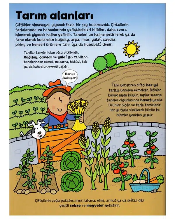 Çocuklar bu kitap sayesinde farklı ülkelerdeki çiftlikleri keşfedebilir, yiyeceklerimizin nasıl üretildiğini öğrenebilirler. Komik ve ayrıntılı çizimler ile çiftlikleri keşfetmeye başlayabilir, kısa yazılarla temel bilgiler öğrenebilirler. Bu kitapla çocuklar düş düçlerini canlandırabilirler.