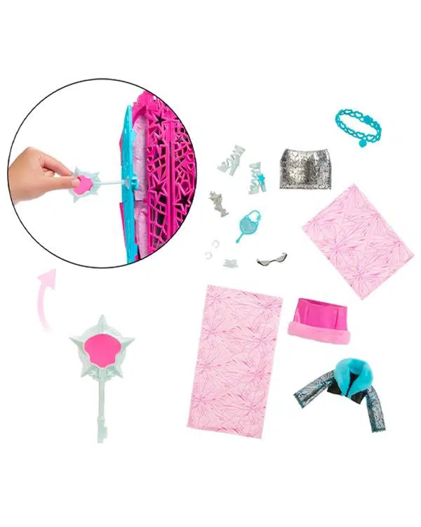 125’ten fazla karıştır ve eşleştir kombinasyonuyla Catty Noir, Hauntlywood sahnesinde parlamaya hazır! Tüm giysilerini ve aksesuarlarını yıldız desenli dolabında saklayabilir, hem oyun hem sergileme amaçlı kullanabilirsin.