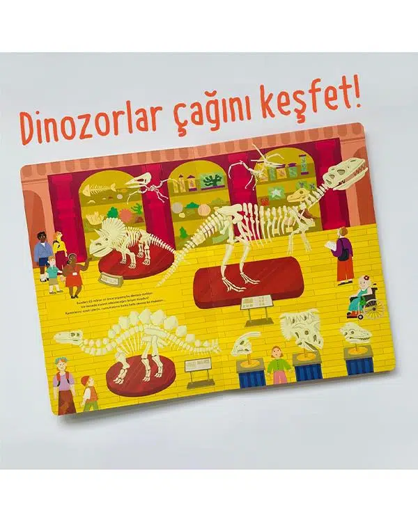 3 yaş ve üzeri çocuklar için uygundur. 3 yaş altı çocuklar aile gözetiminde kullanmalıdır. Çocuk gelişimi uzmanı gözetiminde hazırlanmıştır. Okul öncesi müfredatına uygun olarak hazırlanmıştır. Çocuklar bu kitapla milyonlarca yıl öncesini, dinozorlar çağını keşfe çıkacaklar. Çocukların sözcük dağarcığının gelişmesine, görsel materyalleri okumasına, nesne ve varlıkları gözlemleyerek öğrenmesine yardımcı olur. İçeride sürpriz pencereler seni bekliyor! Dinozorları ve o çağda yaşayan diğer canlıları yaşam alanlarında, canlandırılmış görsellerle anlatan resimli çocuk ansiklopedisi sayesinde çocuklar kitabı kendi başına inceleyebilir, resimlerle hikaye oluşturabilir. Sözlük bölümündeki İngilizce destekli gerçek görseller sayesinde gerçek hayat ve yaşam alanları arasında bağ kurabilirler. Hayal dünyasında keyifli, macera dolu bir yolculuğa çıkabilir.