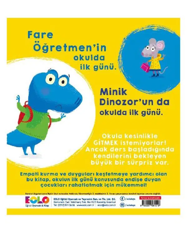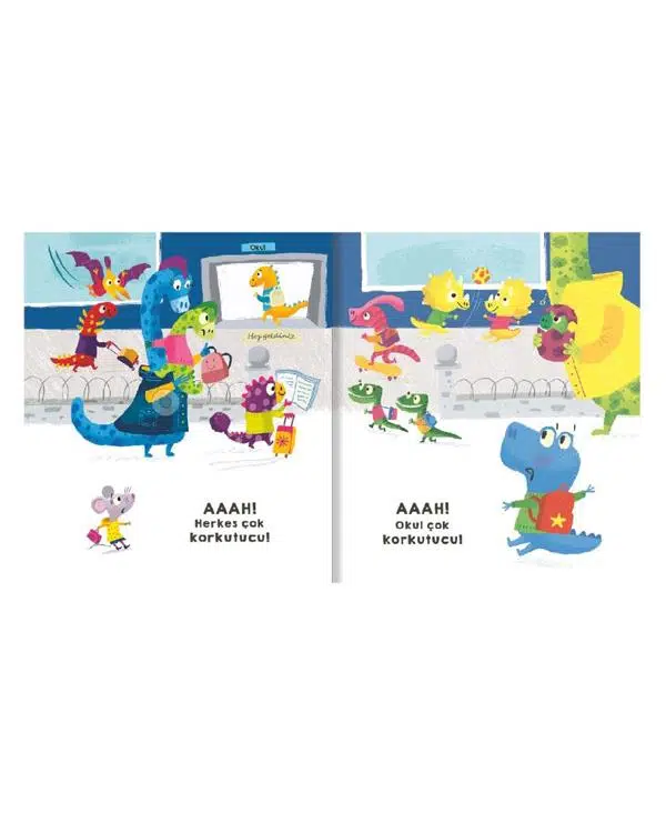 Okulun ilk günü. Lula Bell ve Brain Fitzgerald okula gitmek istemeyen Fare Öğretmen ve Minik Dinozor’un neler hissettiğini eğlenceli bir dille hikâye ediyor. Yeni bir dünyada kendilerine yer edinmeye çalışan miniklere ipuçları veren bu kitap, okula gitmek için pek çok eğlenceli sebebi de fark etmelerini sağlayacak.