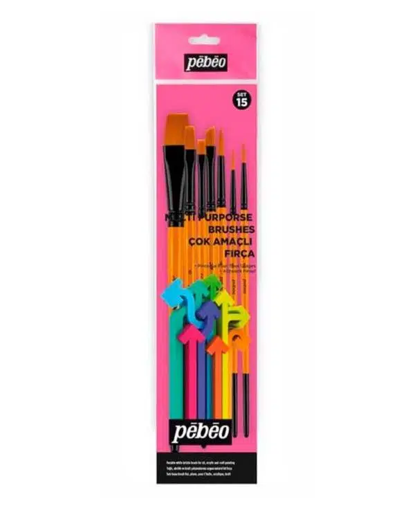 Pebeo Set-15 7 adet çok amaçlı fırça içermektedir. Fırçalar sulu akrilik ve yağlı boya çalışmalarına uygundur. Malzemesi dayanıklı sentetik kıldır.