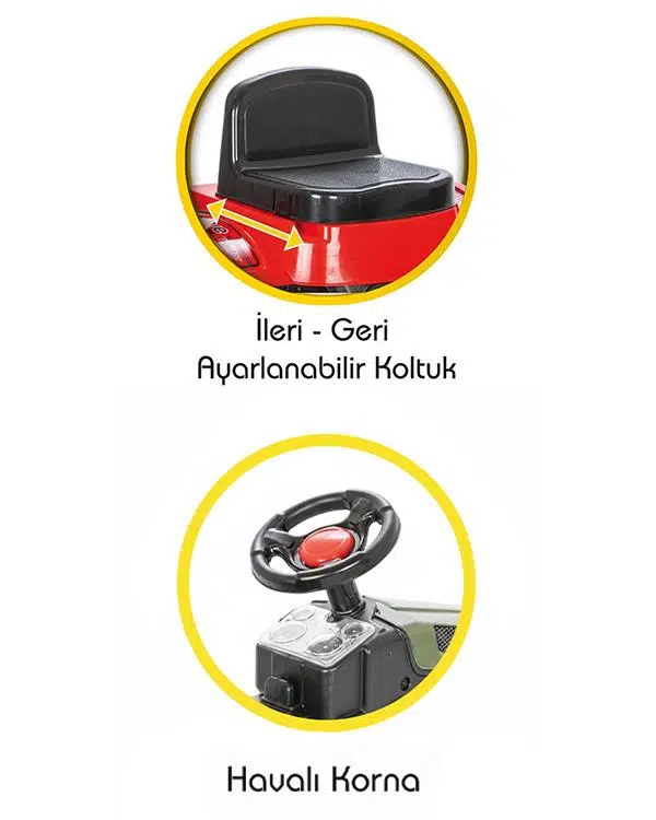 Ayarlanabilir 6 kademeli koltuğu sayesinde farklı yaş ve boydaki çocuklara kolayca uyum sağlar. Zincirli pedal sistemi çocuğun bacak gücünü kullanarak traktörü hareket ettirmesine olanak tanır; bu da hem eğlenceli hem de fiziksel gelişimi destekleyici bir deneyim sunar. Kolay manevra yapılabilen direksiyon sistemi ve sağlam tekerlek yapısı, farklı zeminlerde dengeli bir sürüş sağlar. Çocuk sağlığına uygun, kaliteli ve dayanıklı hammaddeden üretilmesi ise güvenli bir kullanım imkânı yaratır.