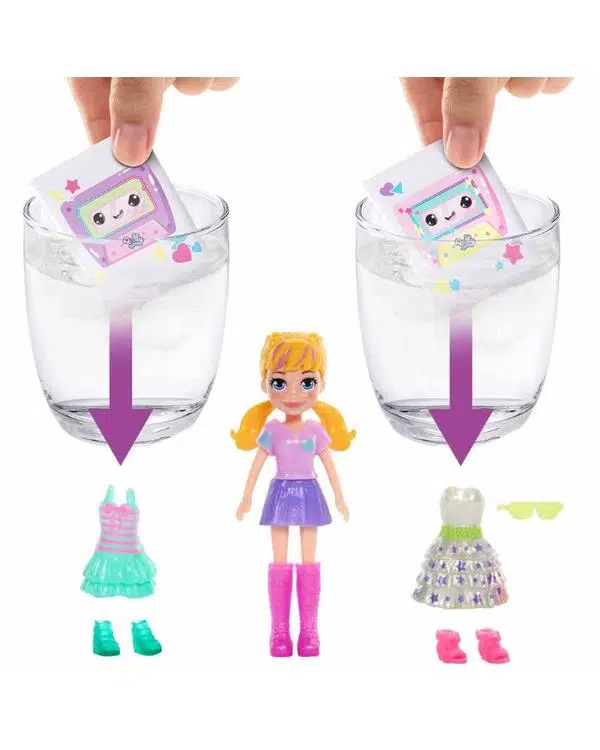Çocuklar, kilitli dolabın arkasındaki 8 cm'lik Polly Pocket, suda çözünebilen ve içinde aksesuarlar bulunan kağıt kese ve Polly için özel bir kapüşonlu üst gibi temaya uygun sürprizleri keşfedebilir.