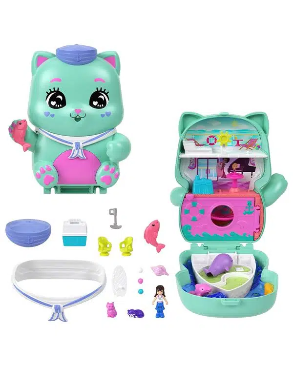 Bu sevimli Polly Pocket Kedicik Yelkende mikro oyun setinin eğlenceli dış kısmı, giydirilebilen bir kedi şeklindedir. Eşsiz moda anlayışını göstermeyi seven çocuklar bu tasarıma bayılacak. Oyun setini açın ve bir yolcu gemisinin harika iç kısmı, 1 mikro bebek ve 2 yavru kedi dahil 10 adet temalı aksesuarı keşfetmeye başlayın. Bebekler hamakta sallanmaya bayılır! Mini golf oynayın veya kaptanlığa bürünüp dümene geçin. Aşağıda yolcu kalmasın! Gitme zamanı geldiğinde seti toplayıp oyun eğlencesini istediğiniz yere taşıyın. Özellikle okyanus maceralarını seven çocuklar için idealdir.